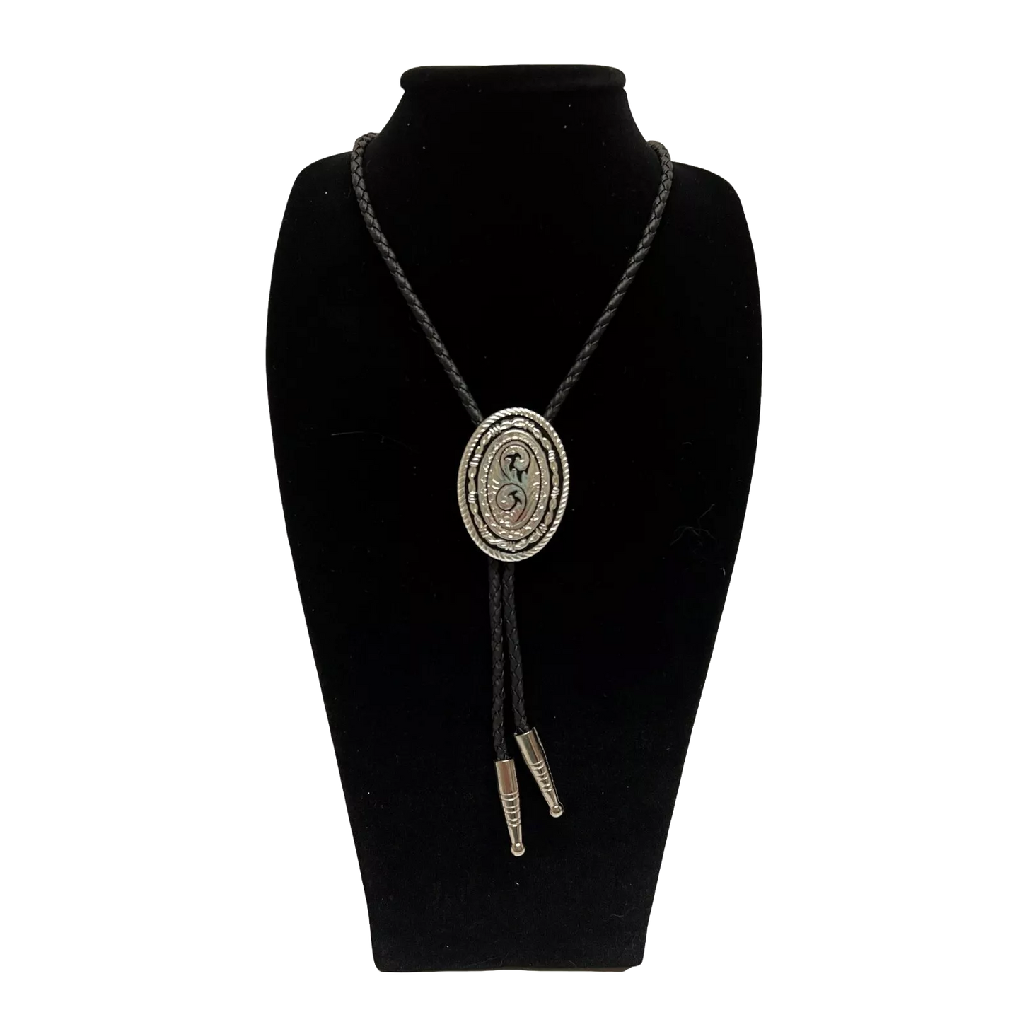 • 36 inch black braided rope with silver tips.