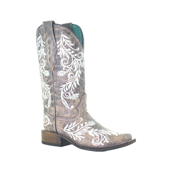6. Corral Ladies Brown with White Embroidery Square Toe Boots A4063