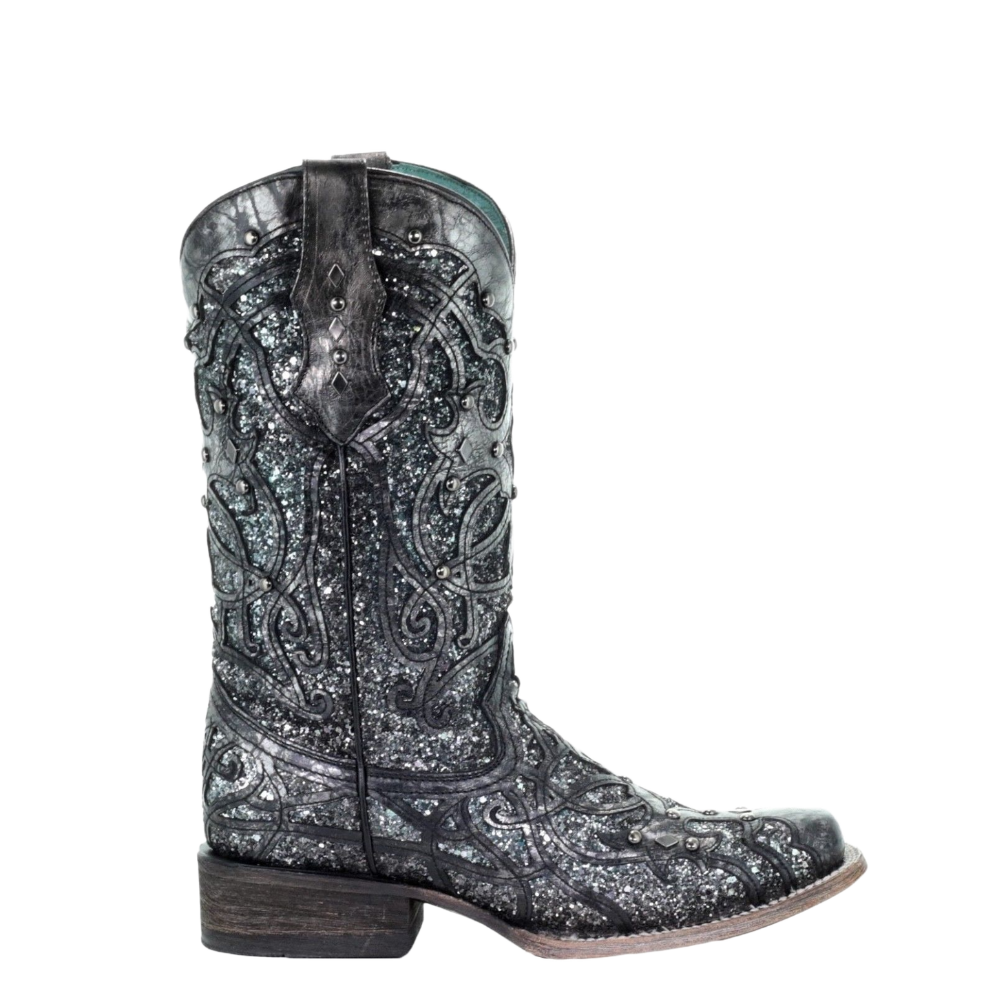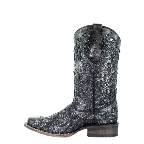 17. Corral Ladies Black Grey Glitter Inlay & Studs Square Toe Boots C3404
