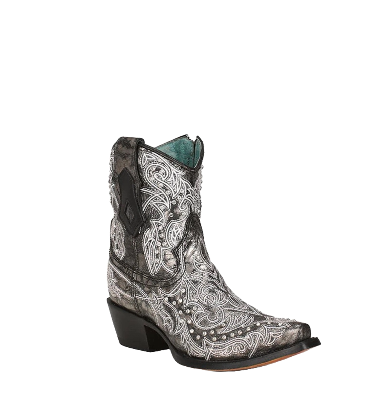 Corral Ladies Black with White Embroidery & Crystals Ankle Boots C3923