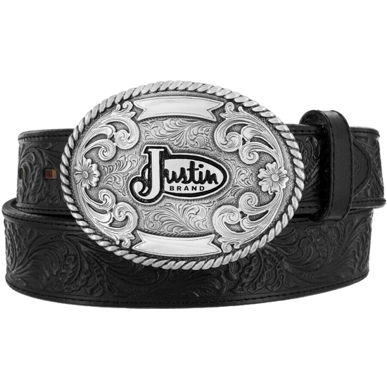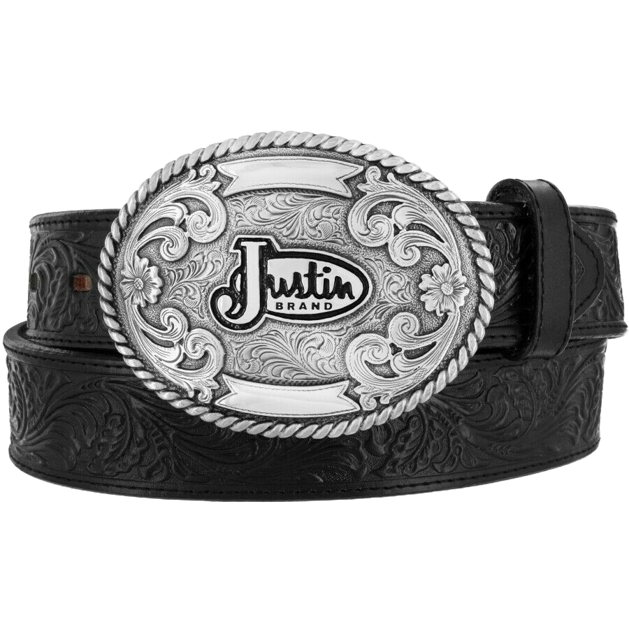 Justin Men's Silver Buckle Black Western Scroll Tooled Belt 53903