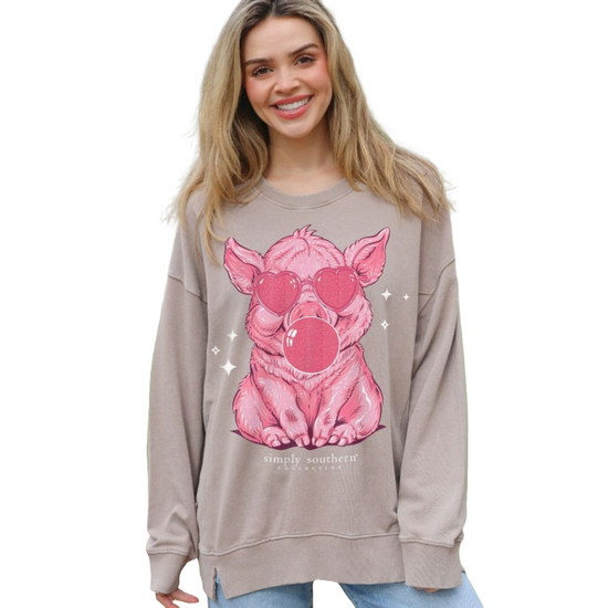 Simply Southern Ladies Bubblegum Blowing Pig Graphic Sepia Pullover SWT-PIG-SEPIA