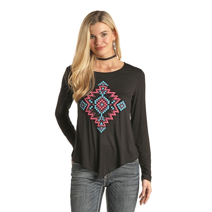 Panhandle Ladies Graphic With Fringe Black Pullover BW91T05401