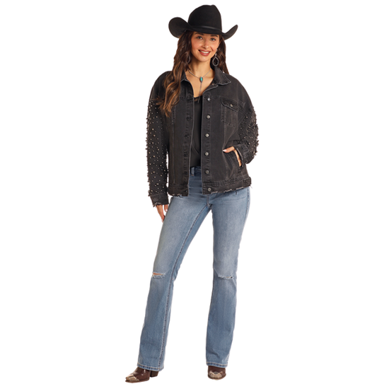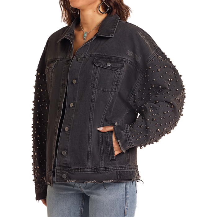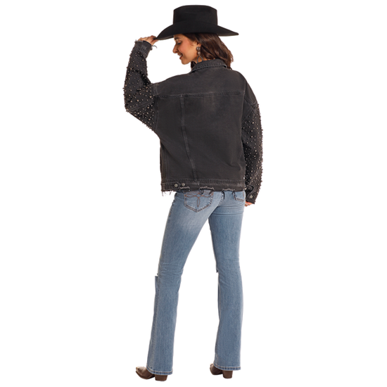 Rock & Roll Ladies Black Distressed Pearl Sleeve Jacket BW92D05348