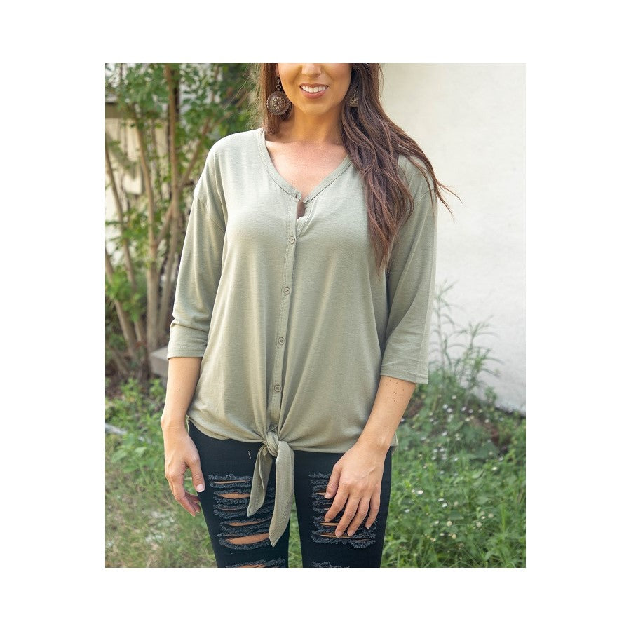 L&B Ladies Olive Button Down With Front Tie Shirt BASIC-10-OE