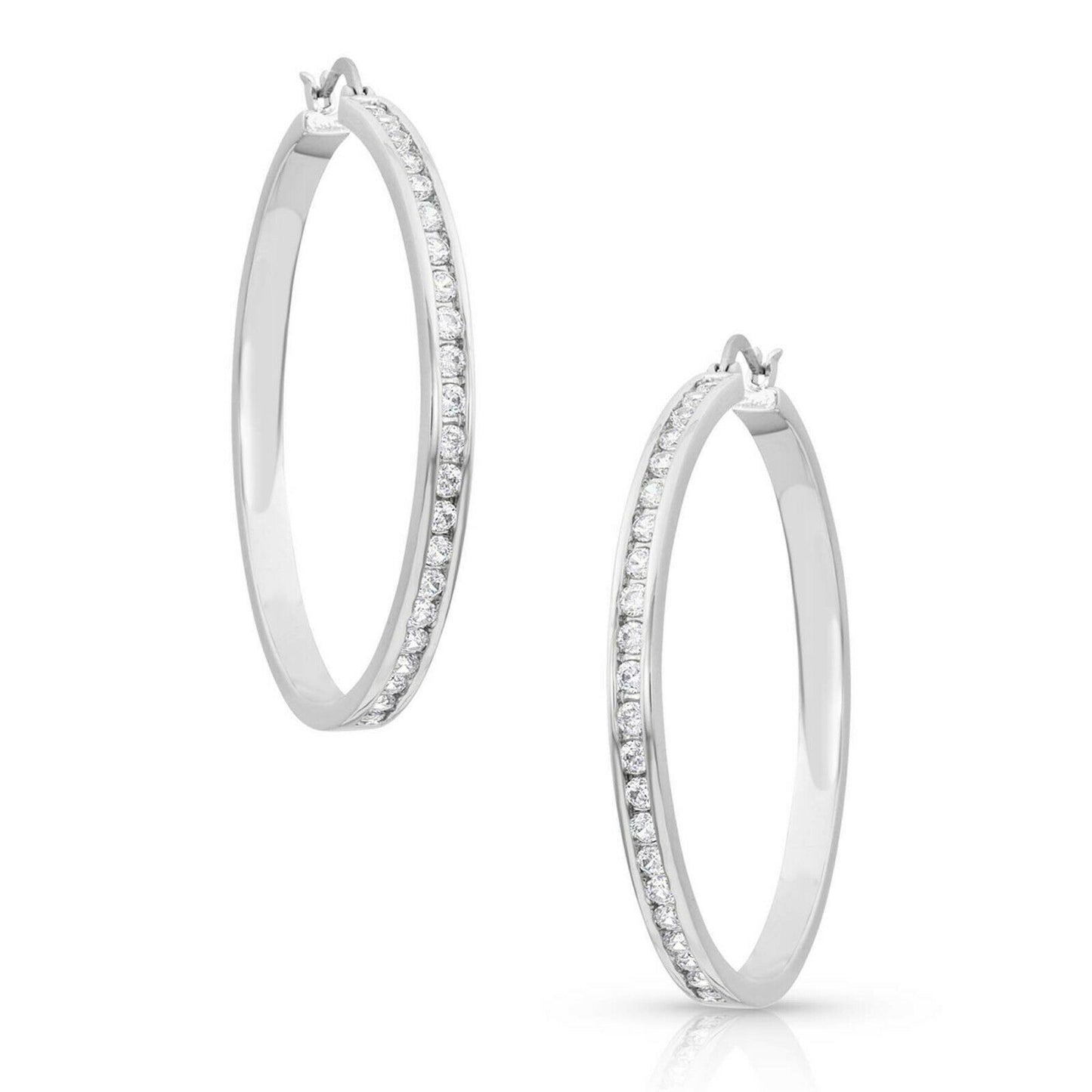 Hoops are a classic that can addd some sass or a clean elegant look depending upon how you wear them. These medium sized silver toned hoops do just that with a middle row of clear round stones that line the front half of the hoops.